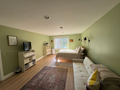 Kitchen: Full kitchen with a full-size fridge, microwave, stovetop, coffee/tea maker, cookware, and starter essentials.